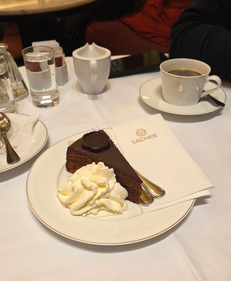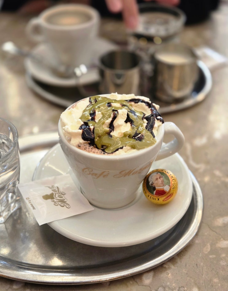 想找奧地利維也納歌劇院附近的經典咖啡廳,Café Mozart 很值得排進行程。就在 Hotel Sacher 旁邊,裝潢復古好拍、甜點選擇多,連熱可可都很有記憶點。若 Café Sacher 排隊太久,來這裡也很可以。