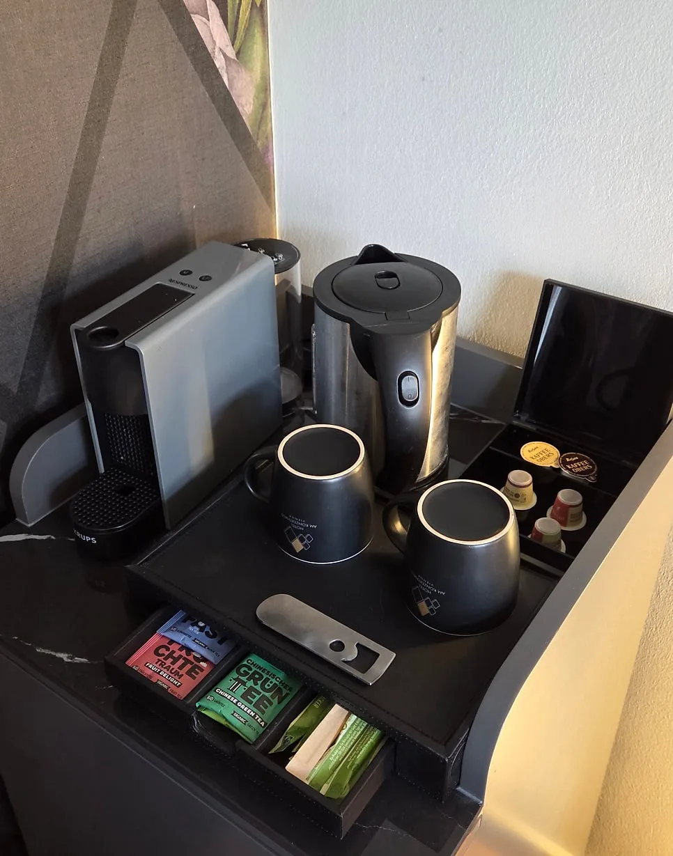 a coffee machine, electric kettle, and tea bags.