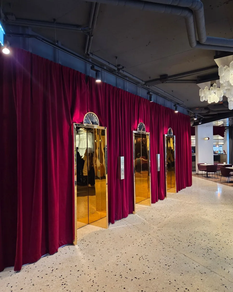 is decorated to look like rich red stage curtains.