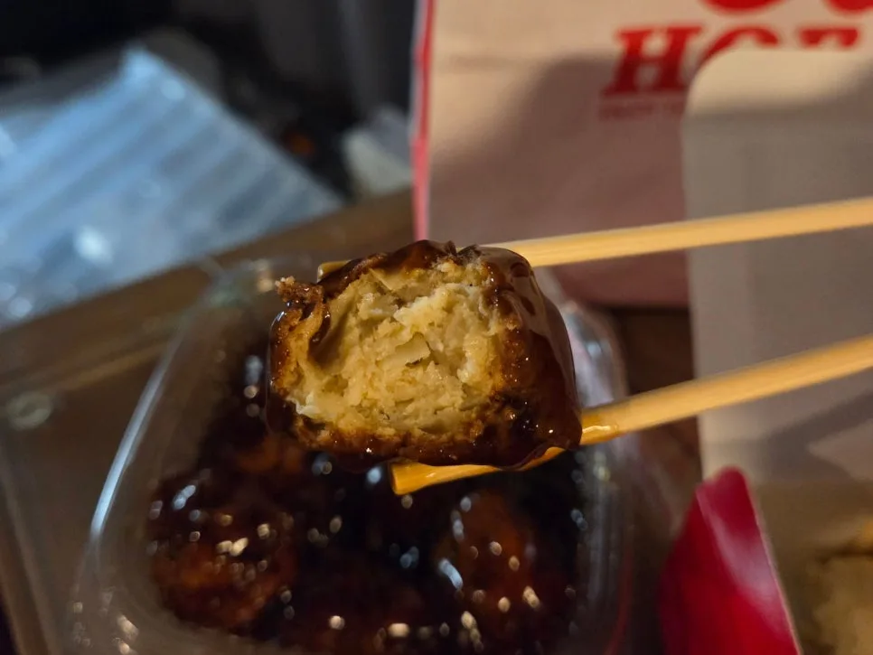 The item was labeled Amazu Dango, which is basically meatballs coated in a sweet-and-tangy sauce.