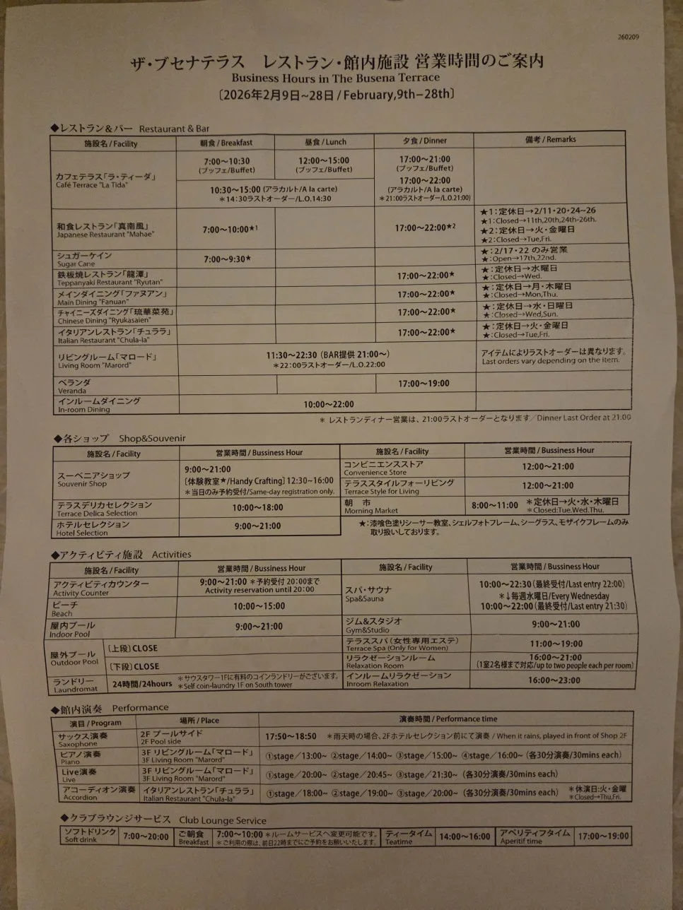 飯店附設設施的開放時間,