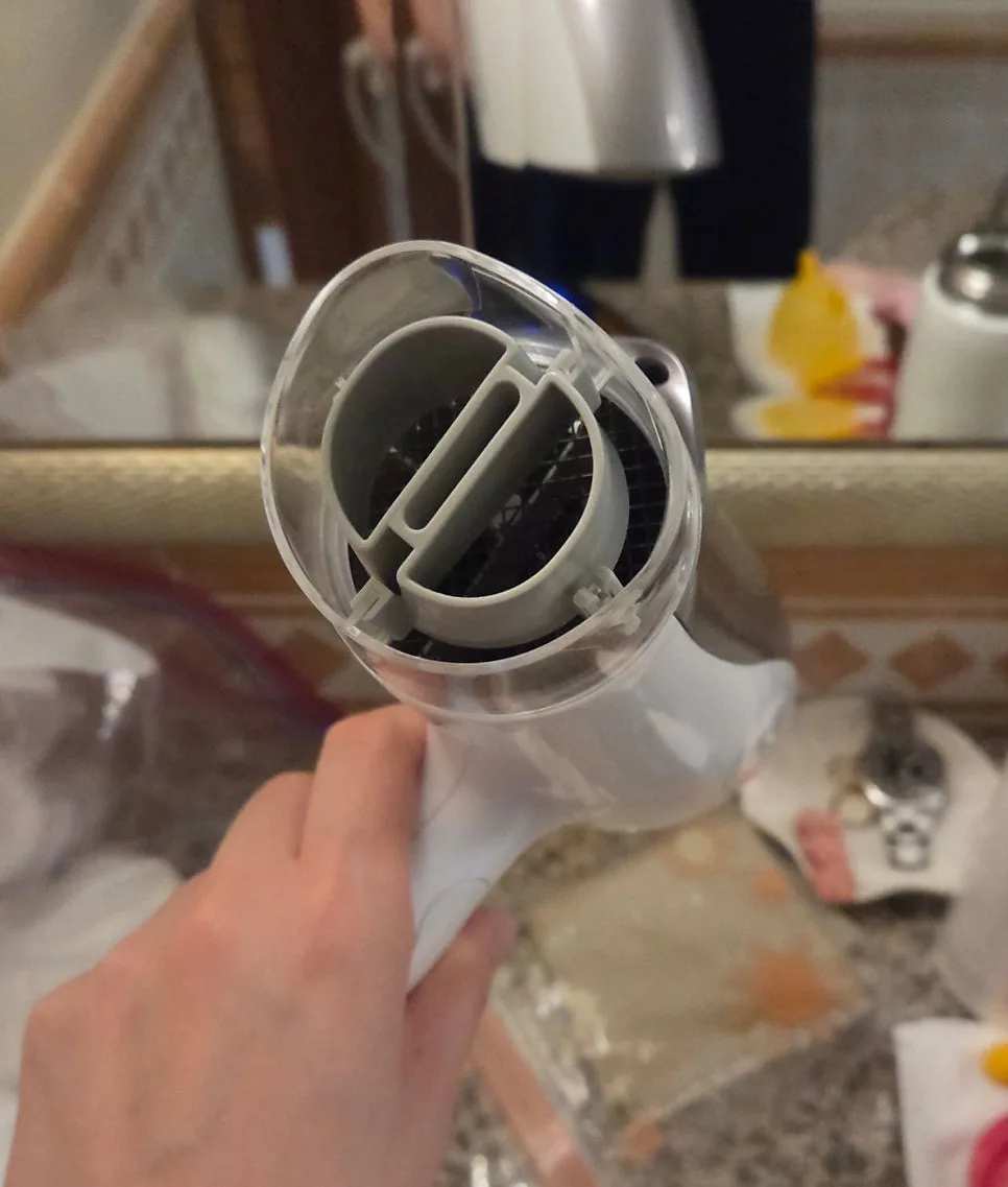 吹風機出風口滿大,風量雖然稍微弱一點,但實際吹頭髮不至於不方便。