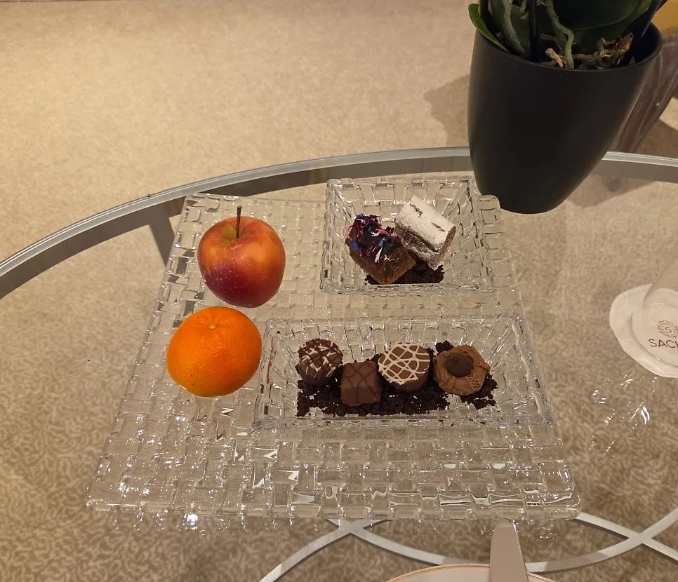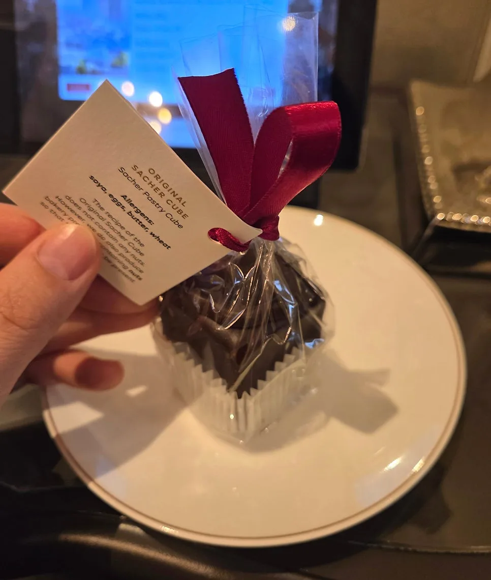 床两侧的床头柜上,各放了一块萨赫招牌甜点——萨赫蛋糕的方块版。